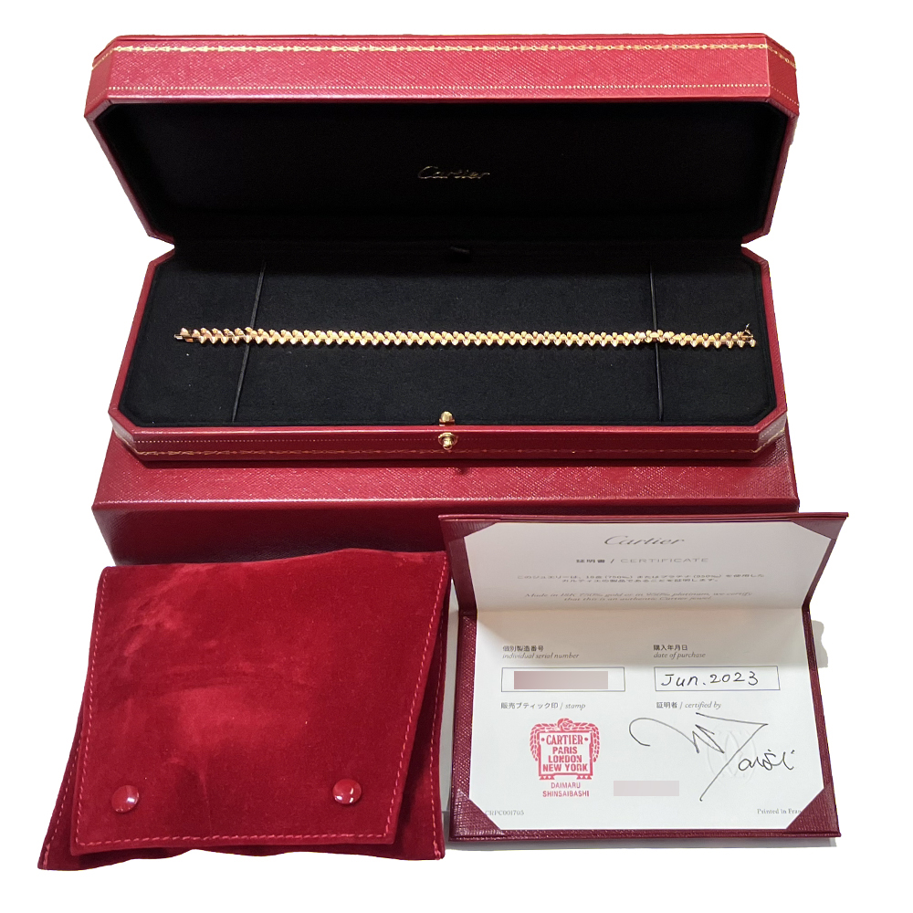 フランス語で“スクエア(正方形)”を意味する「カレ」から生まれたカルティエの象徴的なコードのひとつ「クル カレ」がライン中央に並び、その両サイドにあしらわれた「ピコ」と呼ばれる円錐状のスタッズと幾何学的なデザインコントラストを描く、カルティエ独特のデザインのブレスレットです。 装着すると着け心地が最高です。普段使いにもご使用になれます。男性の方にもおすすめです。