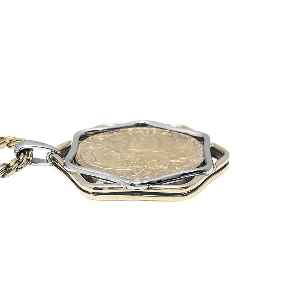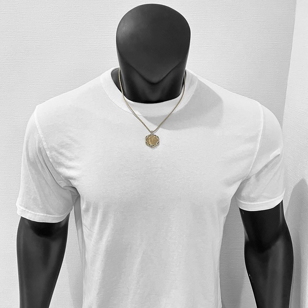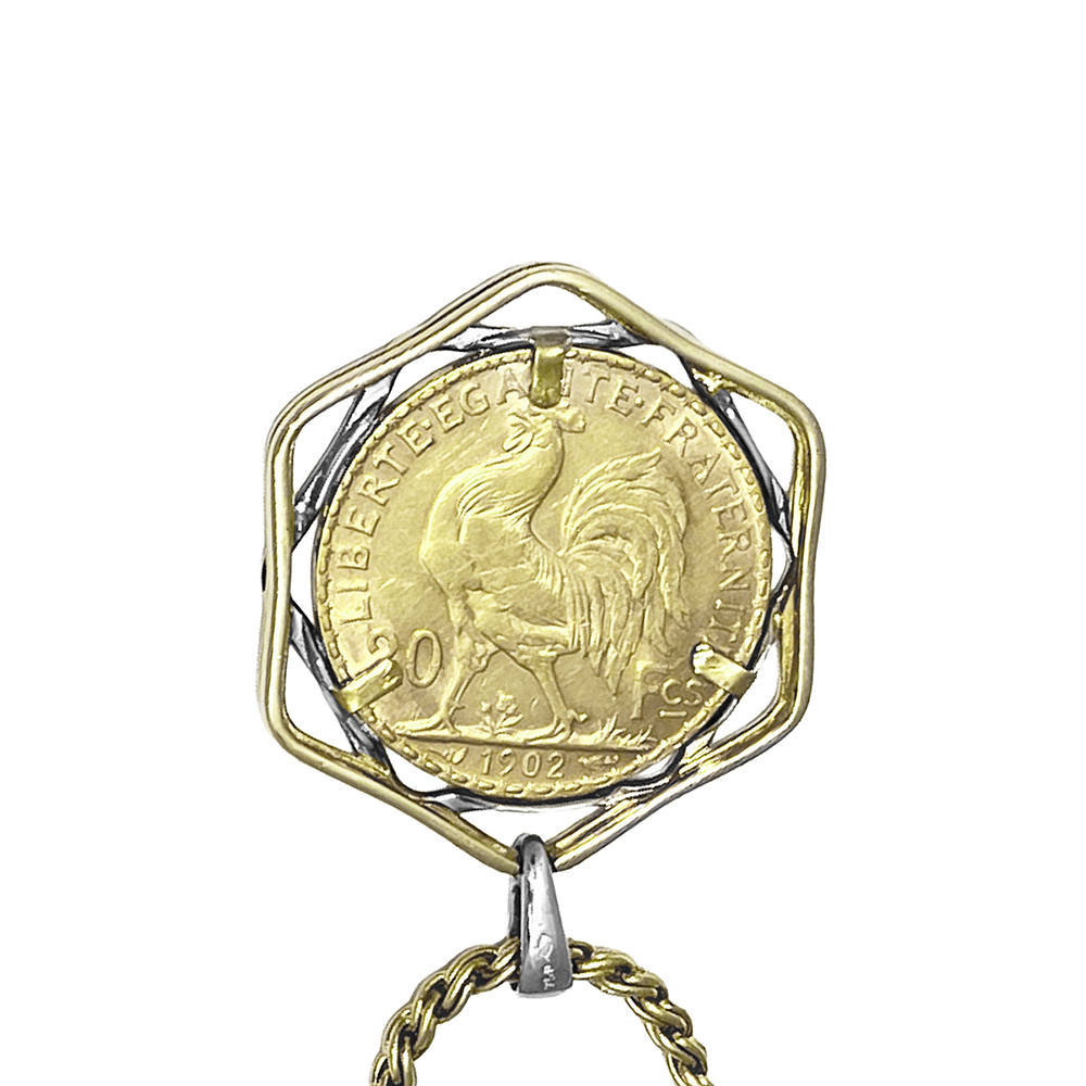 ニワトリは、魔除け・時を告げる・幸運をもたらすと言われており、ジュエリーとしてもヒーリングアイテムとしてもお使いいただけます。イエローゴールドとホワイトゴールドの枠にセットされた金貨が、胸元を豪華な装いにしてくれます。