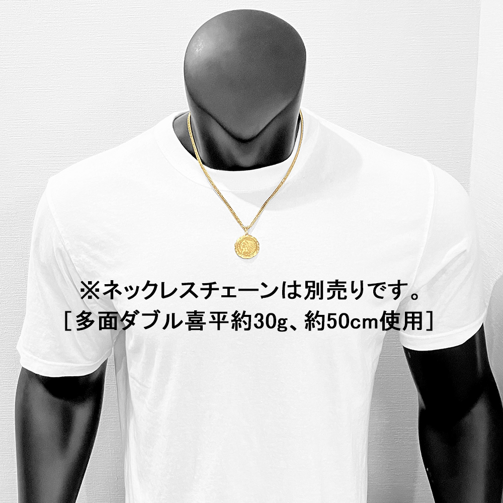 金貨の両サイドに2個ずつダイヤモンドがセッティングされており、装着すると胸元を豪華に演出してくれます。※装着写真のチェーンは別売です。30g・50cmの多面ダブル喜平ネックレスを使用しています。バチカンは別途料金にて加工も承っており大きくする事も可能です。お気軽にお問合せくださいませ。