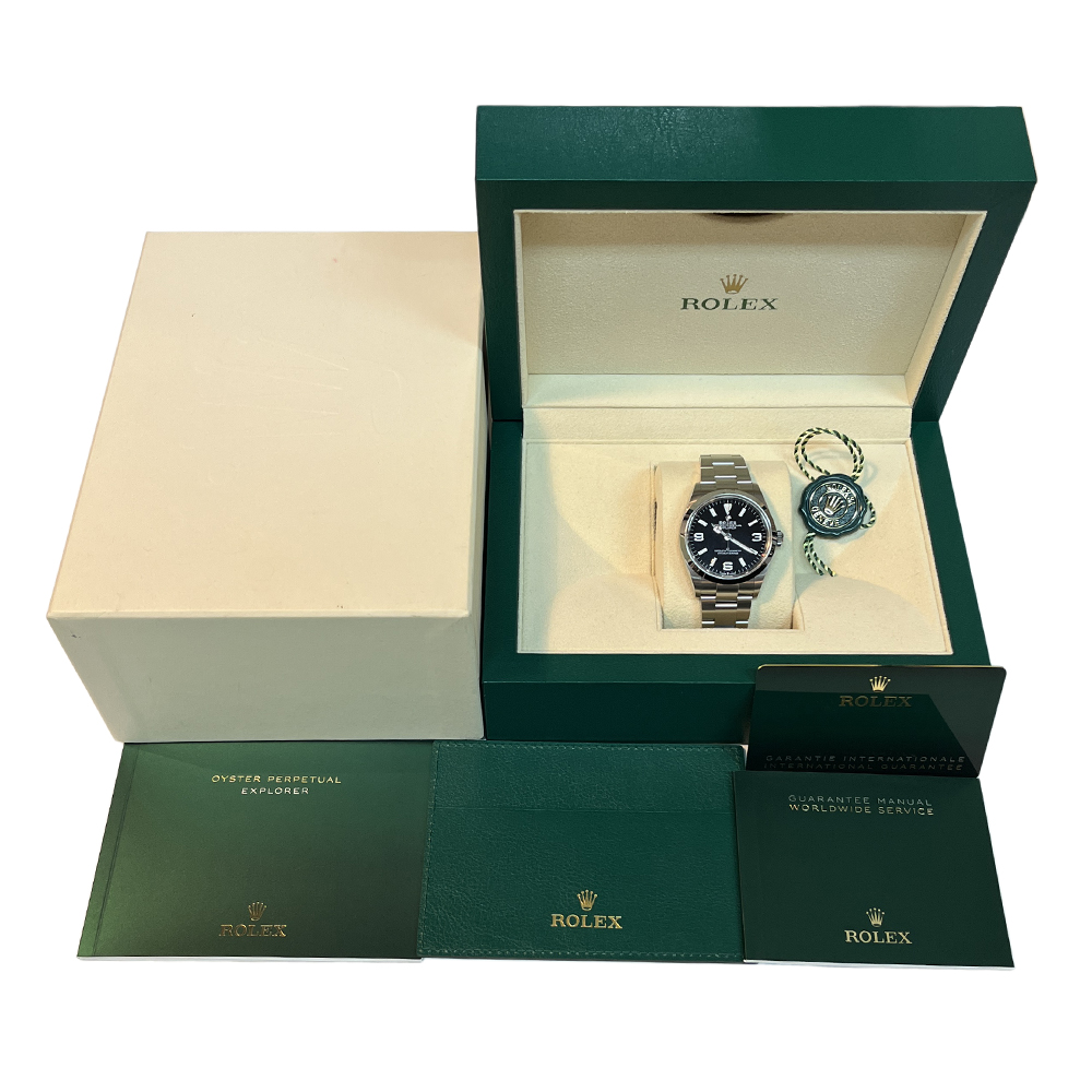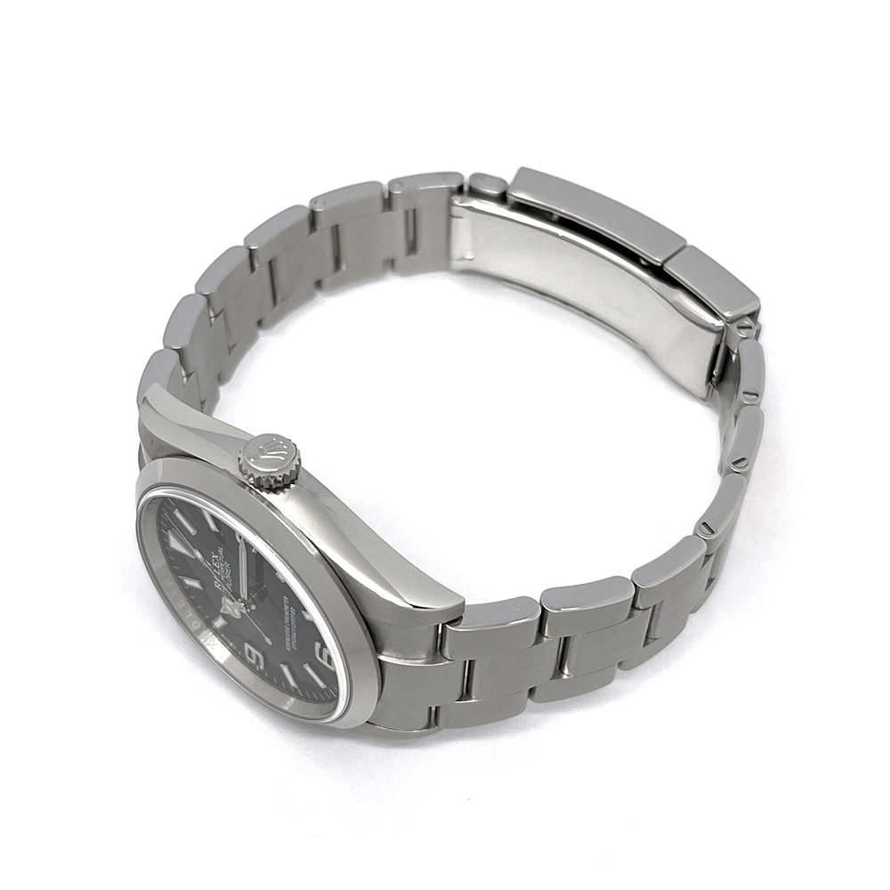 ロレックス エクスプローラー 36 124270 が入荷しました。ロレックス屈指の人気モデル エクスプローラー はシンプルな見た目と実用性の高さから、幅広い世代から支持を集めている定番中の定番です。本品はルーペで拡大して確認すると、微細なスレや傷がありますが、肉眼ではほとんど見えない程度で目立つ傷のない非常にきれいな状態です。ギャランティーに2024年に購入した記載があります。