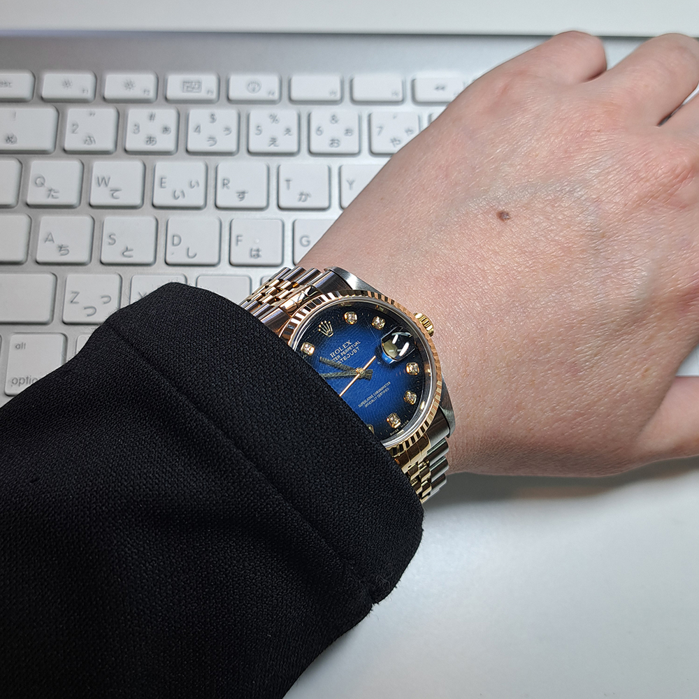 ロレックス デイトジャスト 16233G ブルーグラデーション が入荷致しました。美しいブルーグラデーションに10Pの純正ダイヤモンドをセッティングしたゴージャスなモデルです。こちらの商品は目立った傷等の無い綺麗な状態です。ギャランティに1995年7月に香港にて購入した記載があります。